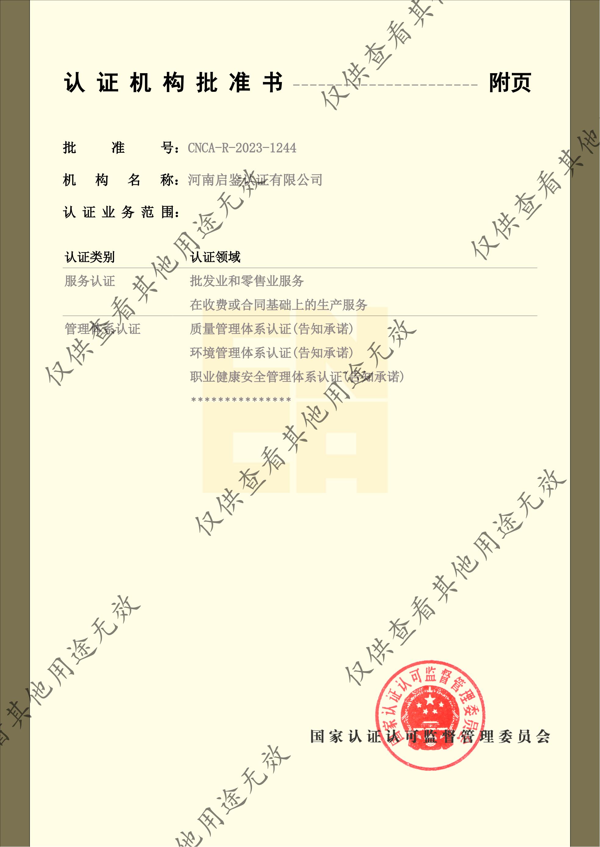 河南启鉴认证有限公司(简称启鉴认证,英文缩写QJC),是经“中国国家认证认可监督管理委员会”批准的第三方认证机构,(认证机构批准书:CNCA-R-2023-1244)。具有从事第三方认证资格,目前获准从事的认证领域有:质量管理体系(ISO9001)、环境管理体系(ISO14001)、职业健康安全管理体系(ISO45001)、企业诚信管理体系(GB∕T31950-2023)、商品售后服务认证等数十种认证项目。